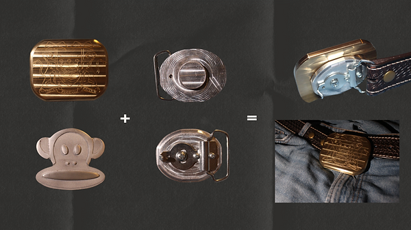 A swappable belt buckle manufactured on CNC using brass and aluminum. The buckle designs attached to the connector using a threading mechanism. The brass buckle design is inspired by my ethnic background and the Sierra Leonean emblem of the Coat of Arms. The Aluminum design is inspired by Paul Frank, a childhood icon in the likes of Hello Kitty and Domo.